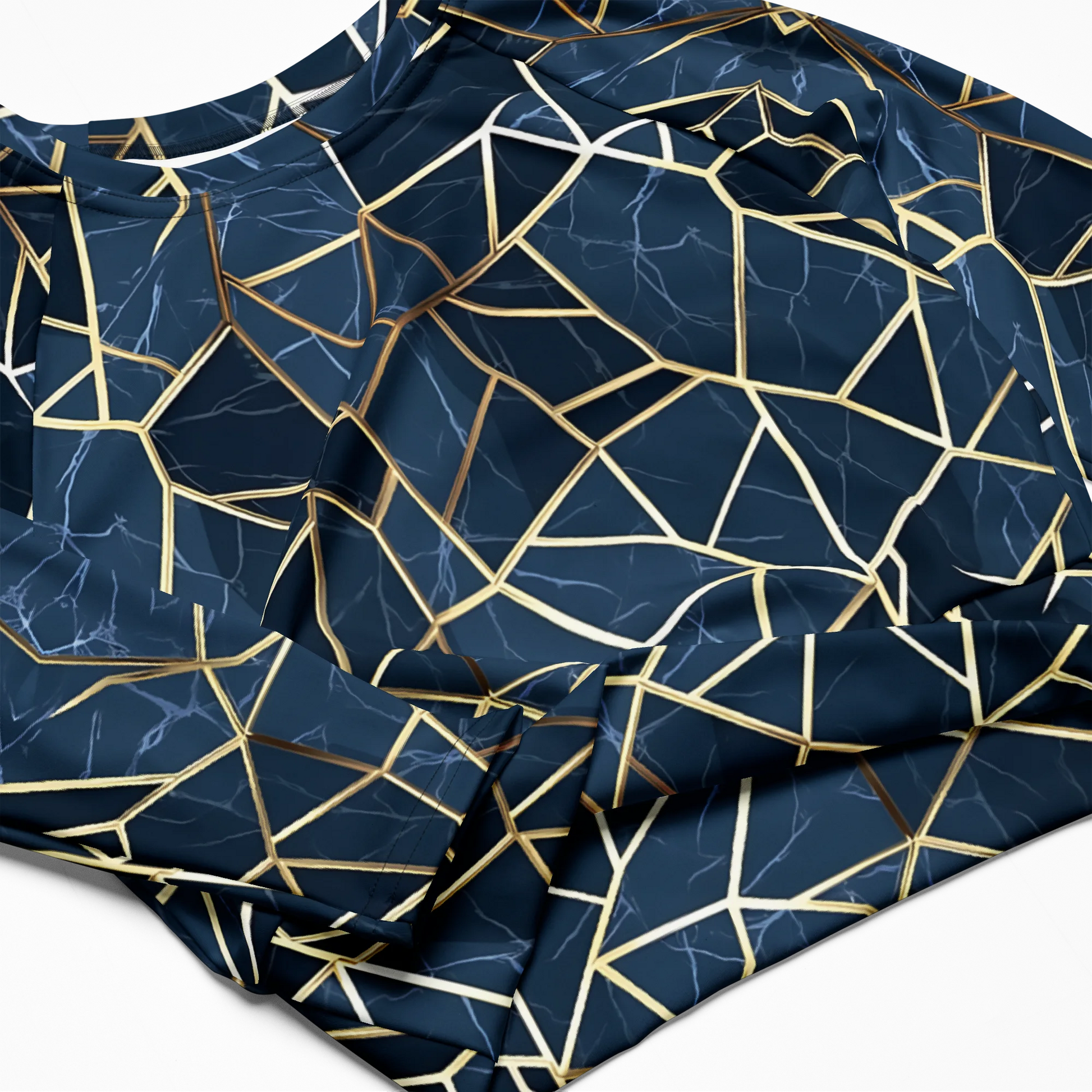 Discover effortless chic in the Blue Geometric Nordic Sky Recycled Long-sleeve Crop Top. It features a calming blue geometric pattern and is crafted from recycled materials, making it the perfect addition to any sustainable wardrobe. Look stylish and make eco-friendly choices at once with this unique and timeless top.