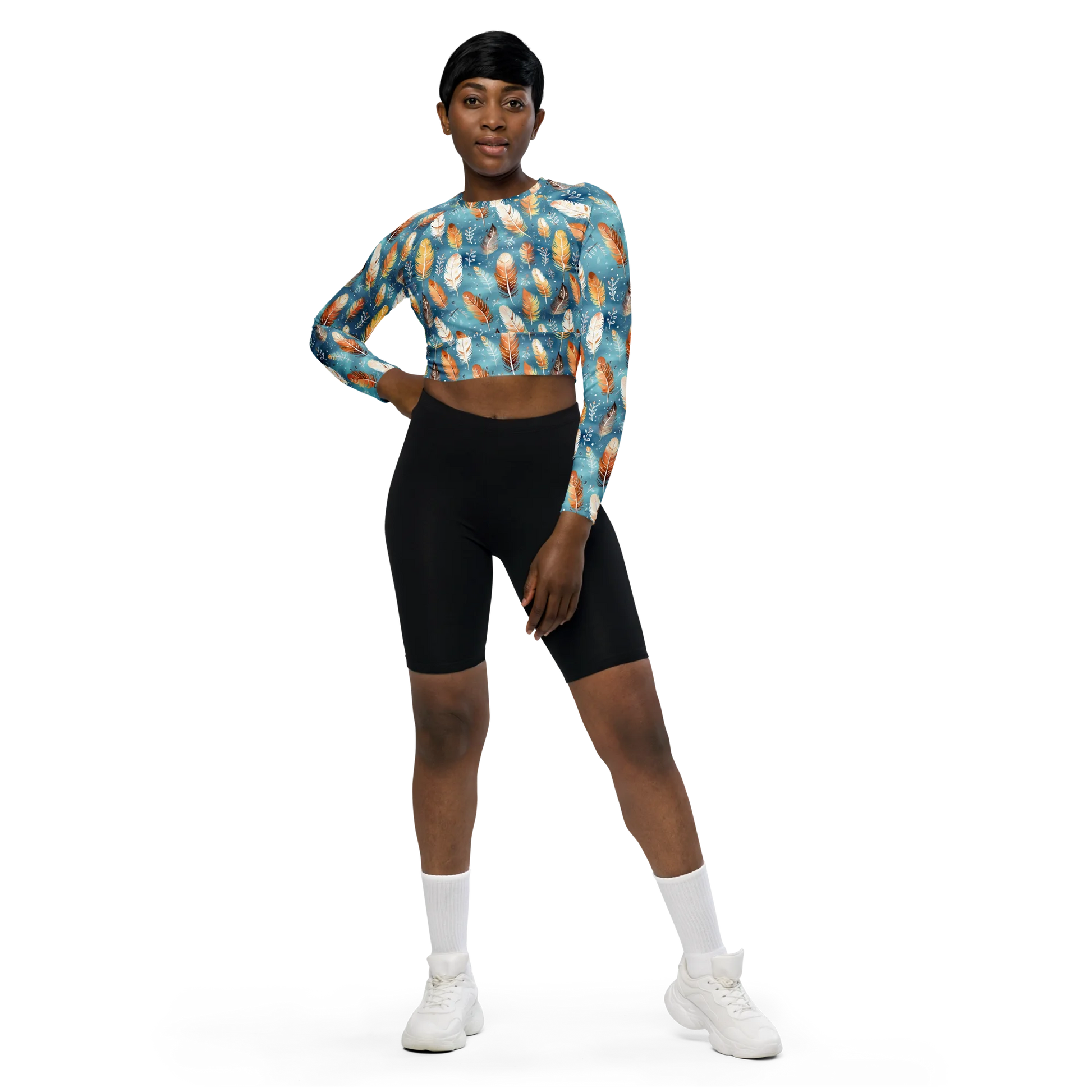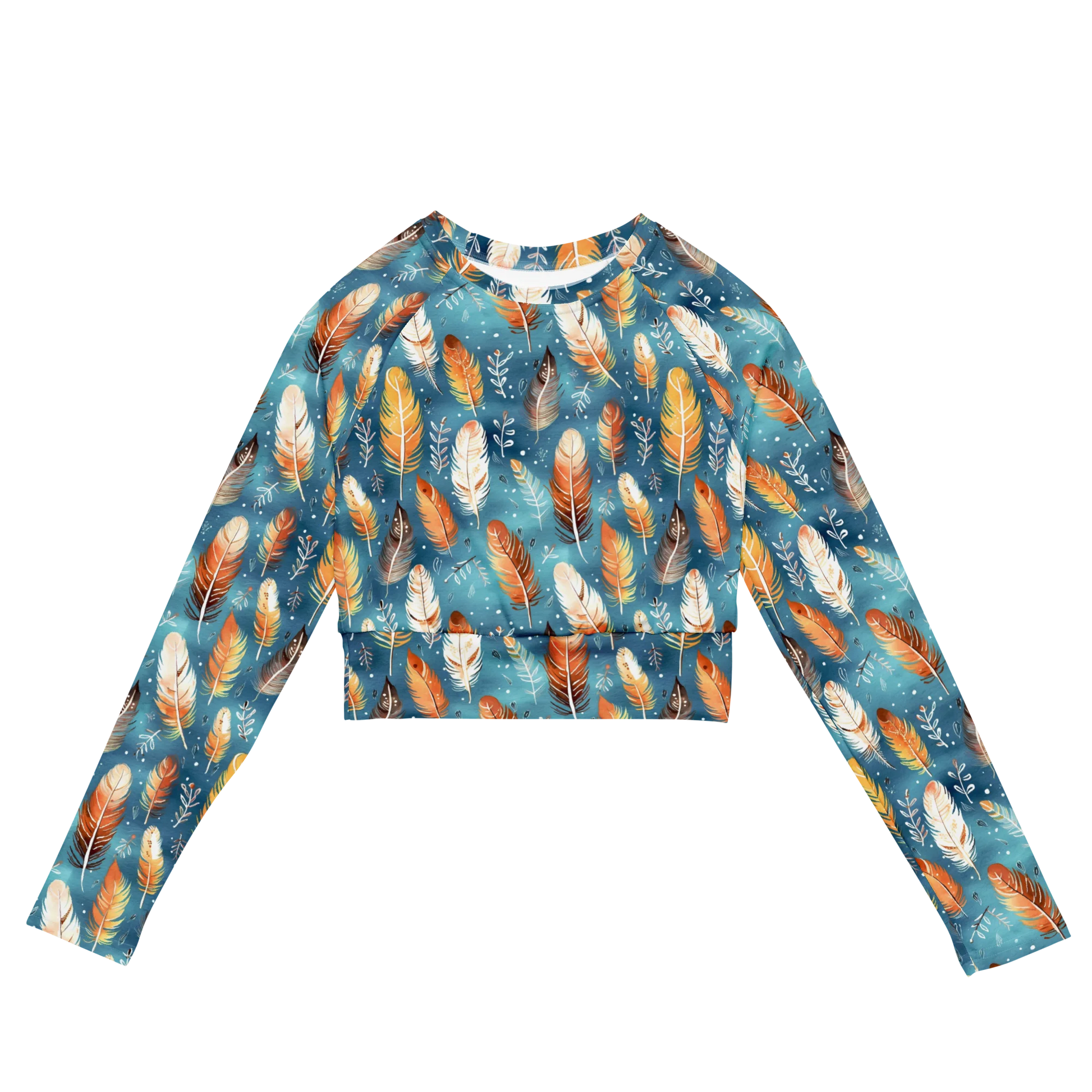 Look stylish and sustainable with the Blue & Orange Feather's Tale Recycled Long-sleeve Crop Top. The eye-catching feather pattern in contrasting colors creates a dynamic look that will turn heads. Crafted from recycled materials, this crop top is the perfect blend of fashion and eco-friendliness. Stand out with every wear!