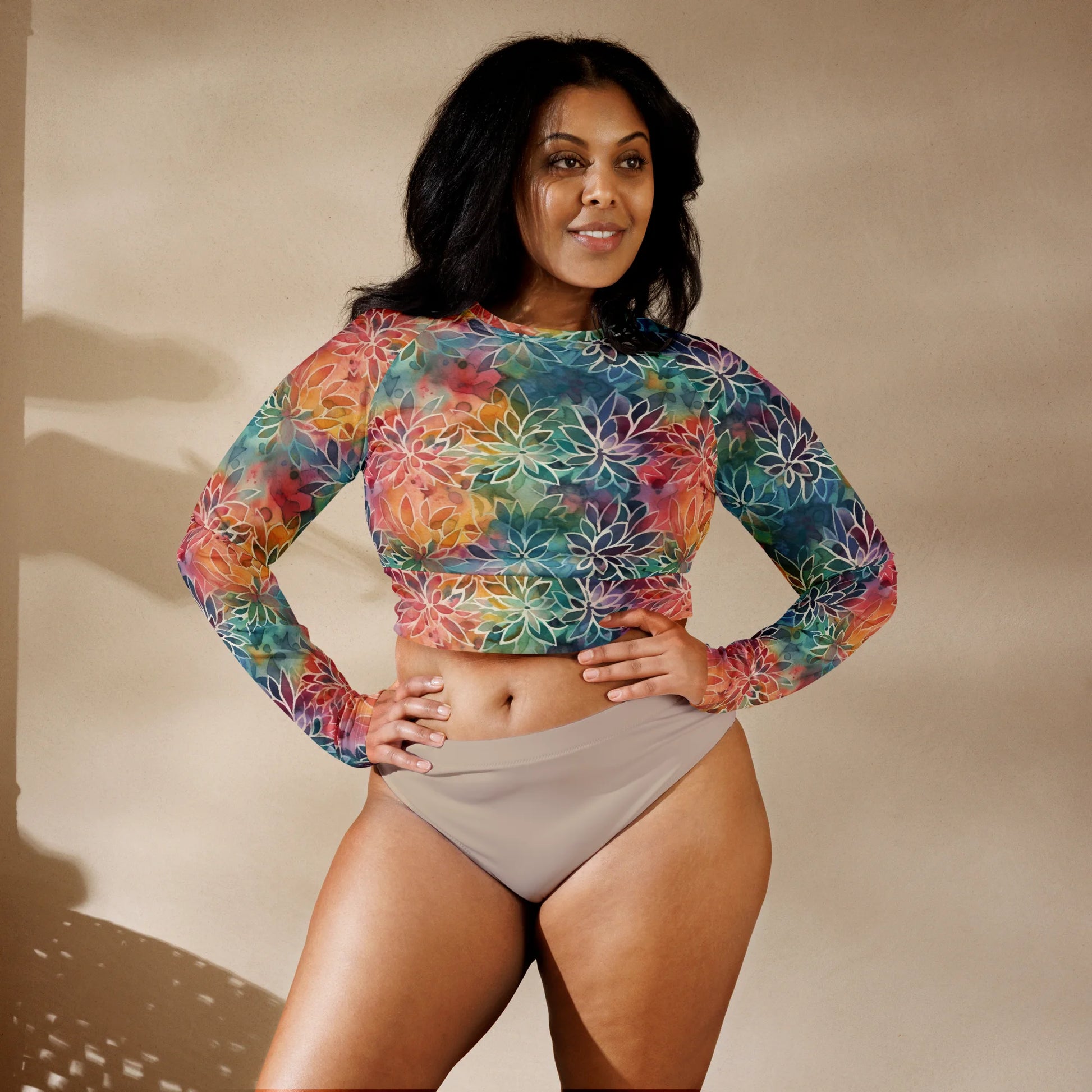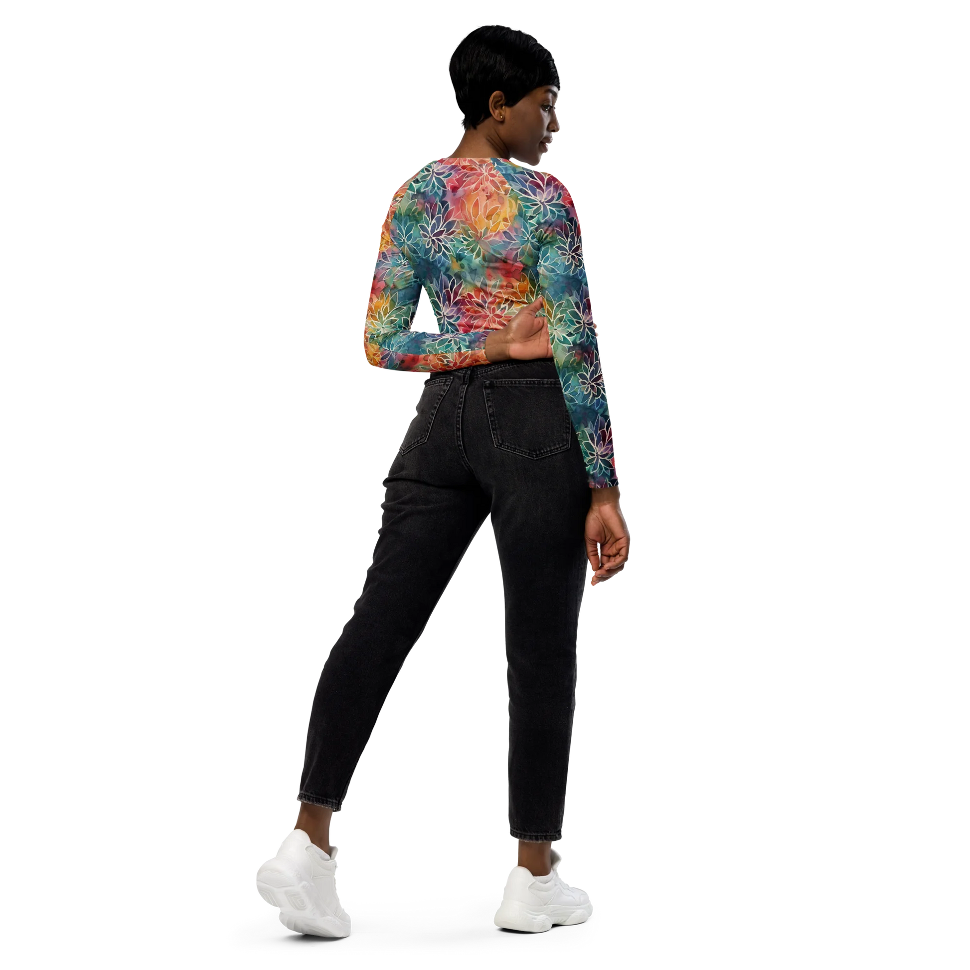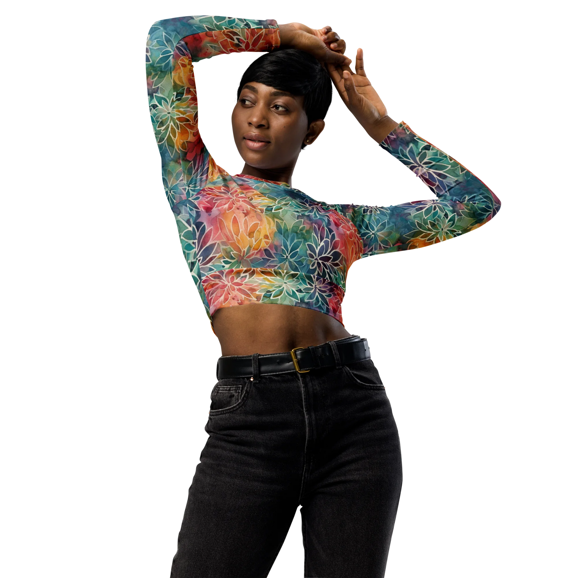 Make a fashion statement and show your commitment to sustainability with this Colorful Summer Floral Abstraction Recycled Long-sleeve Crop Top. The vibrant floral pattern will bring a burst of energy to your look, while its eco-friendly construction ensures a stylish and sustainable wardrobe. Express your individual personality with this artful and sustainable crop top.