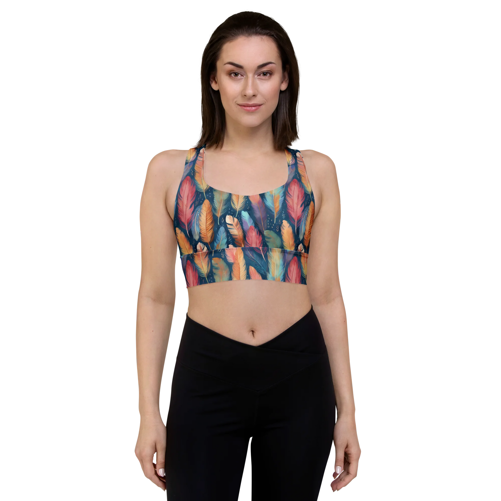 Enhance your workouts with the Dance of Wild Birds' Feathers Longline Sports Bra. With its stylish feather pattern, this sports bra offers optimum support and comfort for all-day wear. Create a sense of freedom and elegance on your active journey with a sports bra perfect for both style and performance.