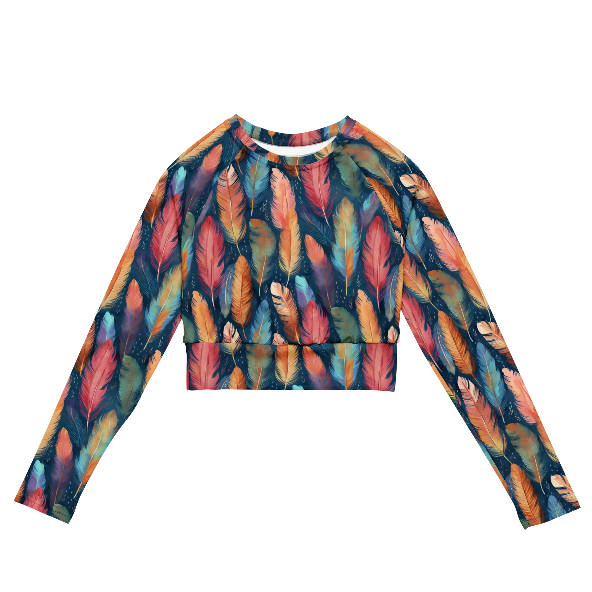 Show your love for the environment with the Dance of Wild Birds' Feathers Recycled Long-sleeve Crop Top. This sophisticated feather pattern provides a sense of freedom and elegance. Crafted from recycled materials, the stylish crop top is both eco-friendly and flattering. Express your unique style with this stylish and sustainable top.
