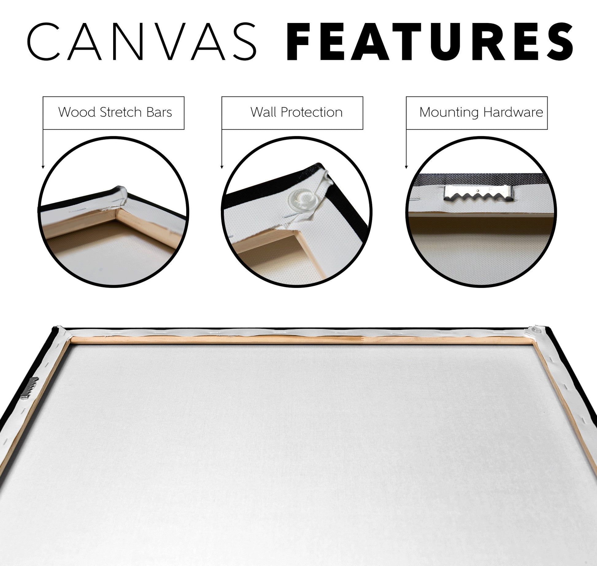 • Beveled Wood Stretch Bars - Make frame less noticeable on front of canvas.