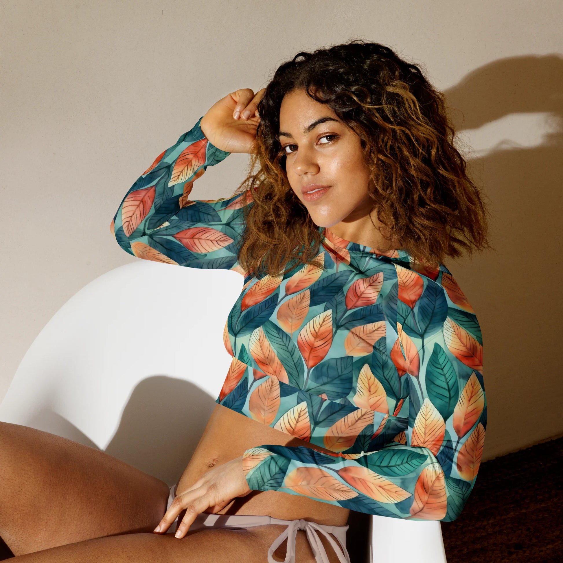 This Leafy Minimalism Recycled Long-sleeve Crop Top keeps your style simple yet stylish! Its clean and modern leafy pattern and cropped silhouette provide a perfect fit and comfort for any occasion. Feel great knowing it's made of eco-friendly recycled polyester and elastane, perfect for swimming, sports, or athleisure outfits. Get yours today and embrace effortless fashion!