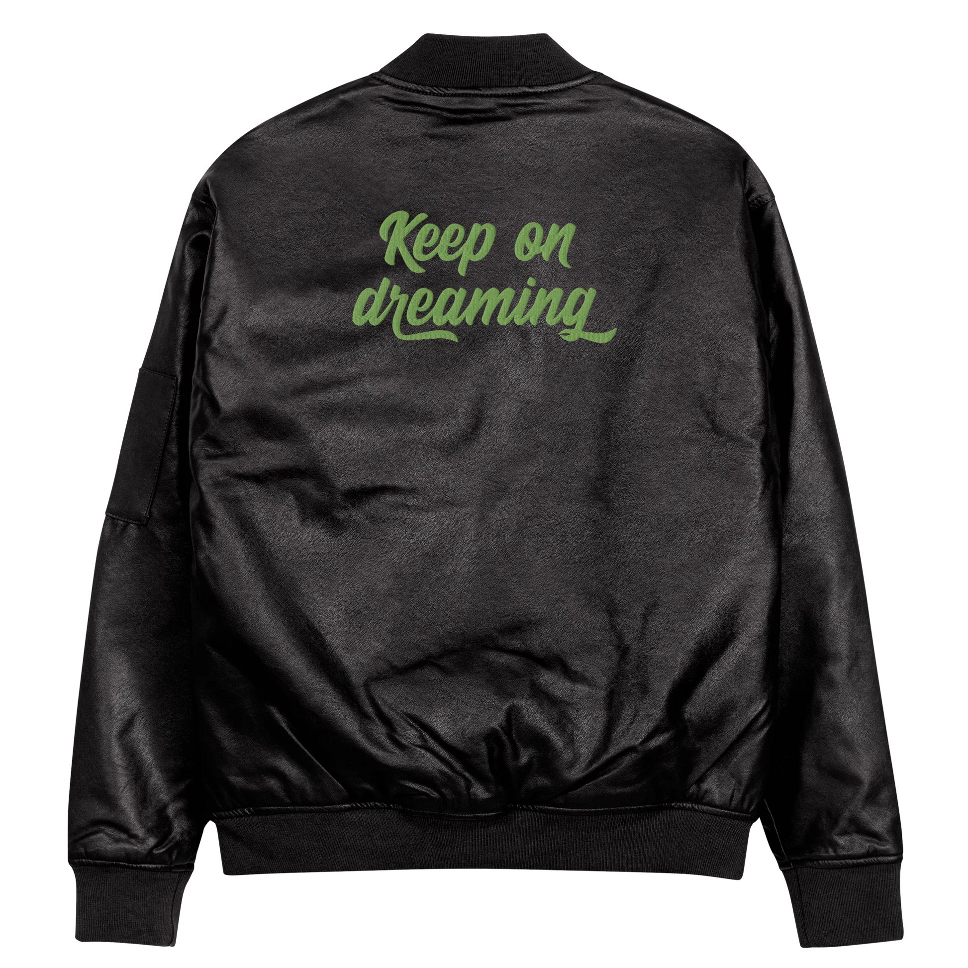 Make a bold statement and take your dreams to the next level with our Keep On Dreaming Embroidered Faux Leather Bomber Jacket! With superior-quality embroidered detailing, this stylish jacket allows you to express yourself and pursue your aspirations in style. Get your look ready to be remembered!