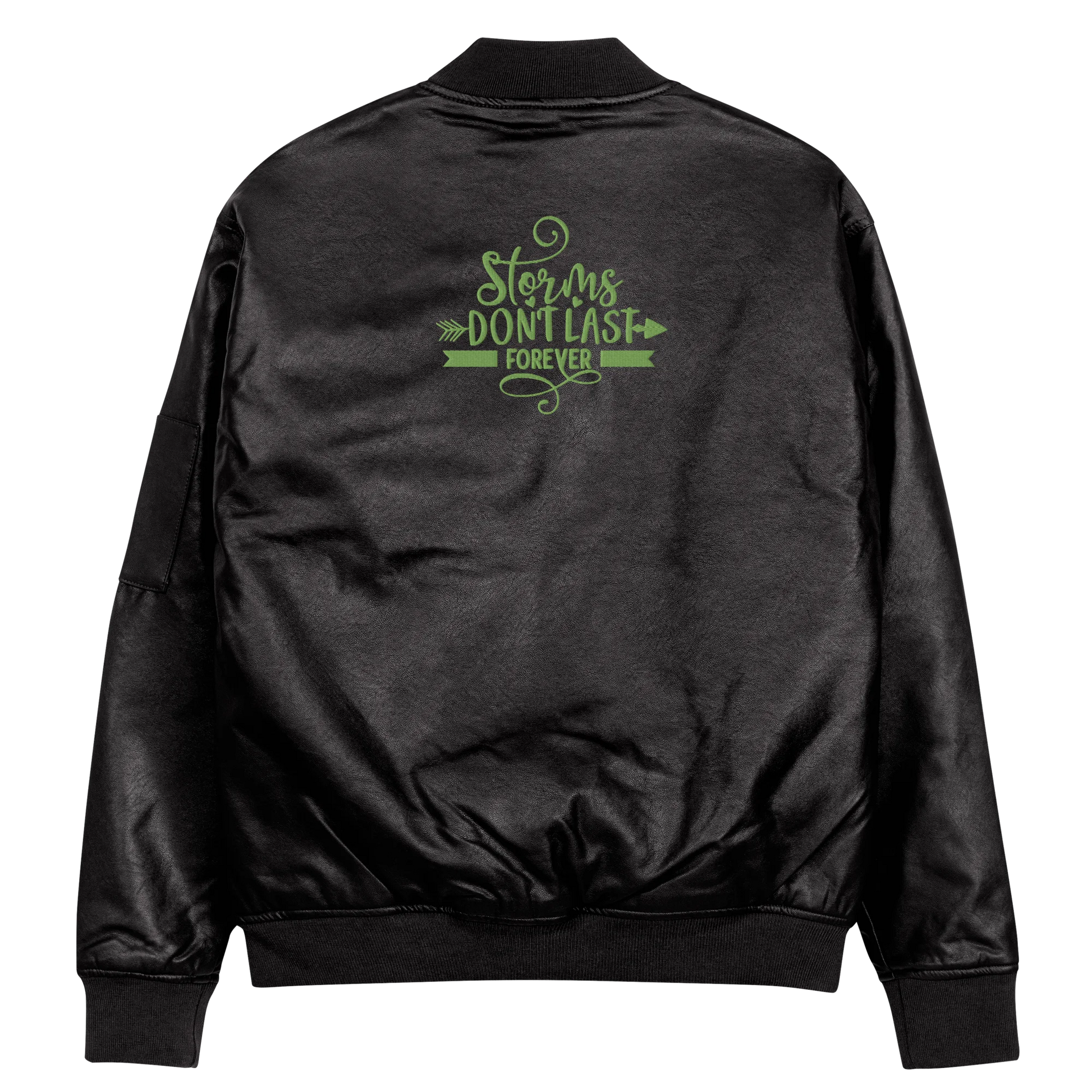 Withstand the storm and stay stylish with this Storms Don't Last Forever Embroidered Faux Leather Bomber Jacket. A bold symbol of resilience, this durable piece is made with superior-quality embroidery for an elevated look. Embrace life’s challenges in style.