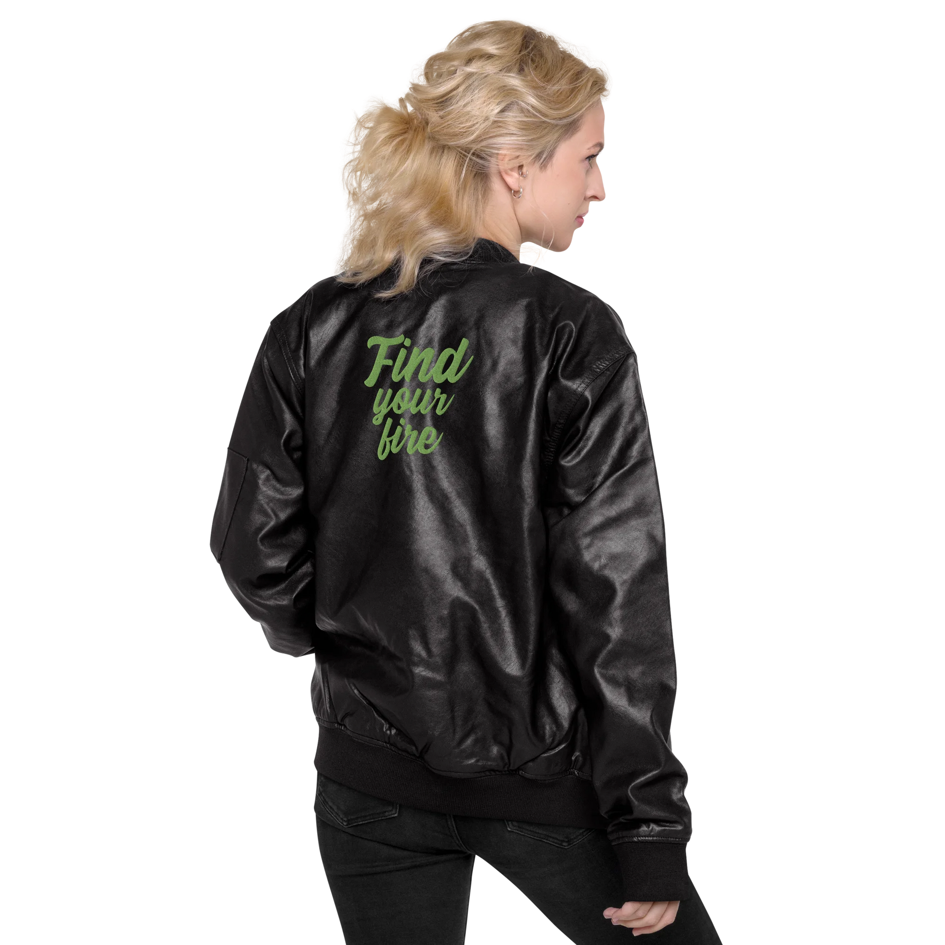 Ignite your style and passion with our Find Your Fire Embroidered Faux Leather Bomber Jacket. The intricate embroidery elevates your look to a new level of sophistication and exclusivity. Make the sustainable choice that lights up your inner fire and keeps you looking fashionable!