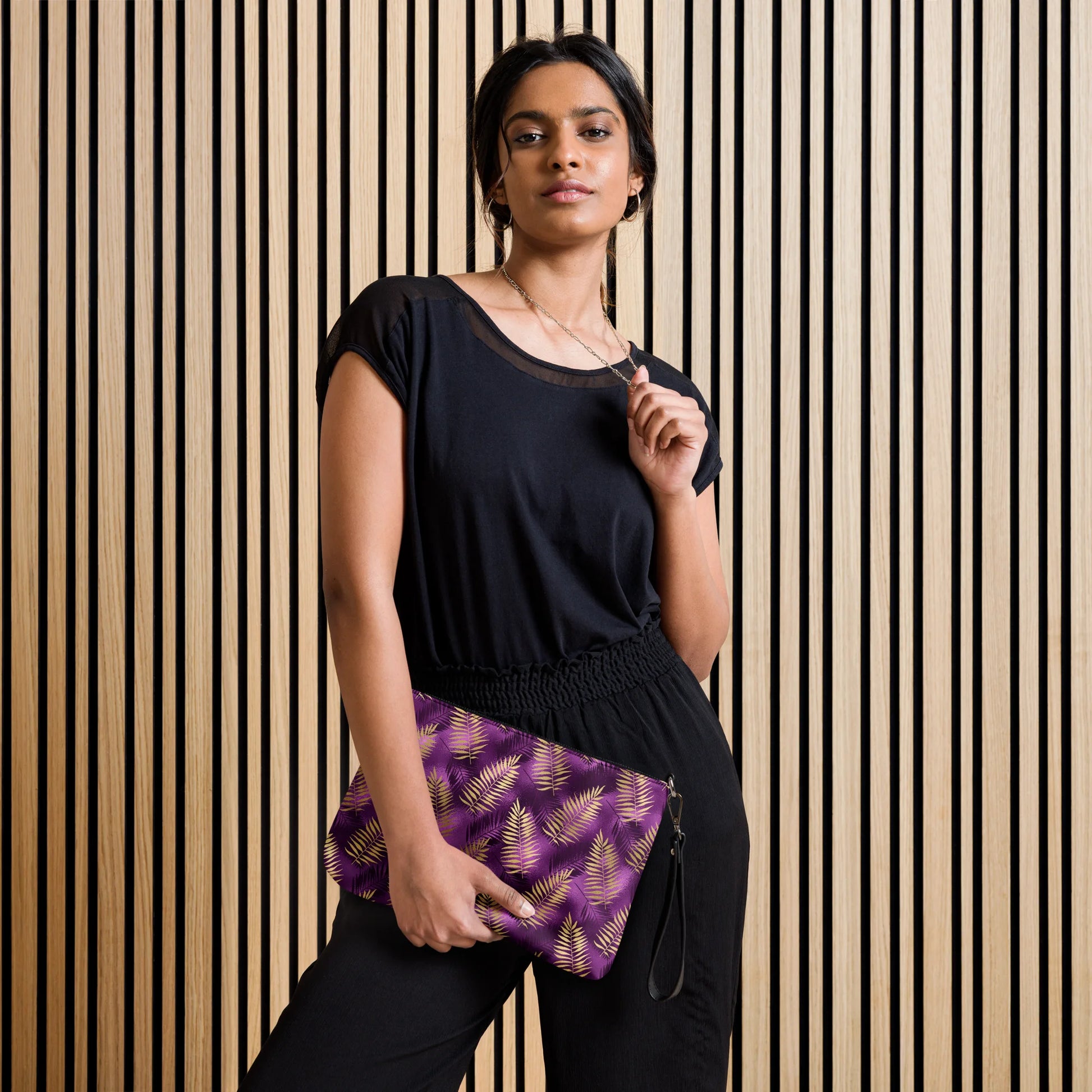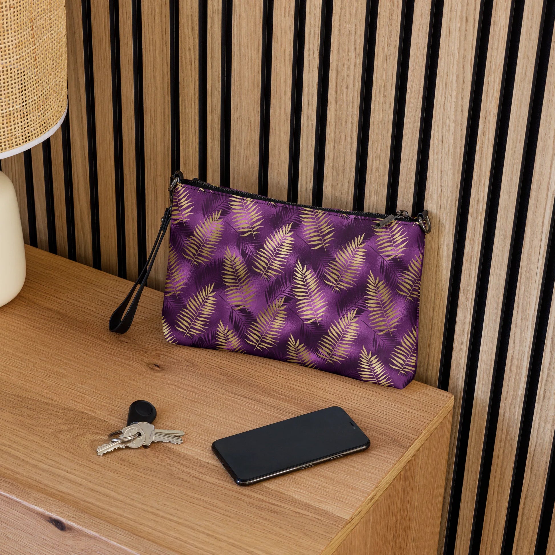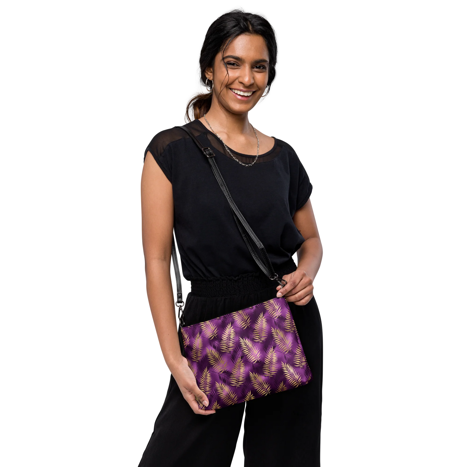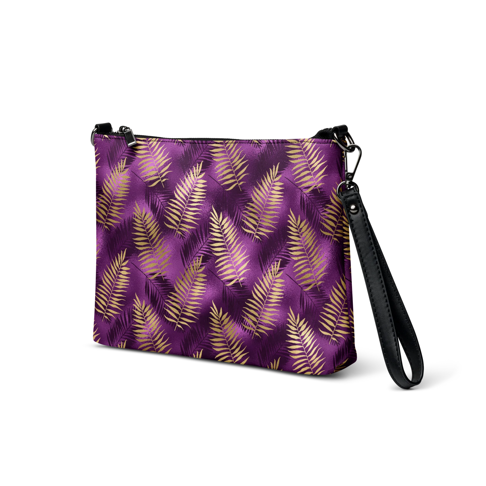 The Violet & Gold Tropical Magic Crossbody Bag is the perfect accessory for any adventure. This stylish bag combines vivid colors and a tropical-inspired design to make you feel like you've been transported to an alluring paradise. Embark on your next journey with this bag to feel the magic of the tropics.