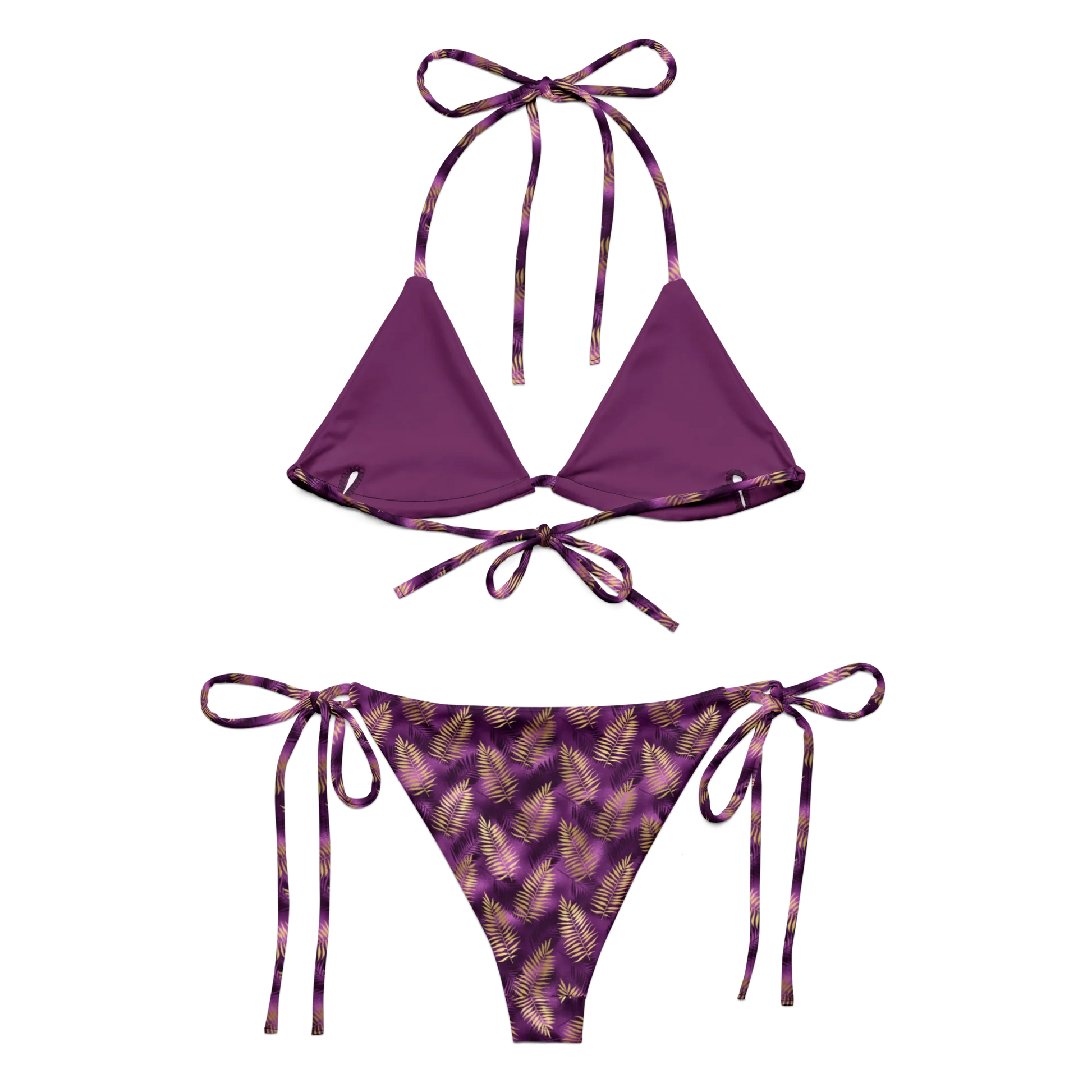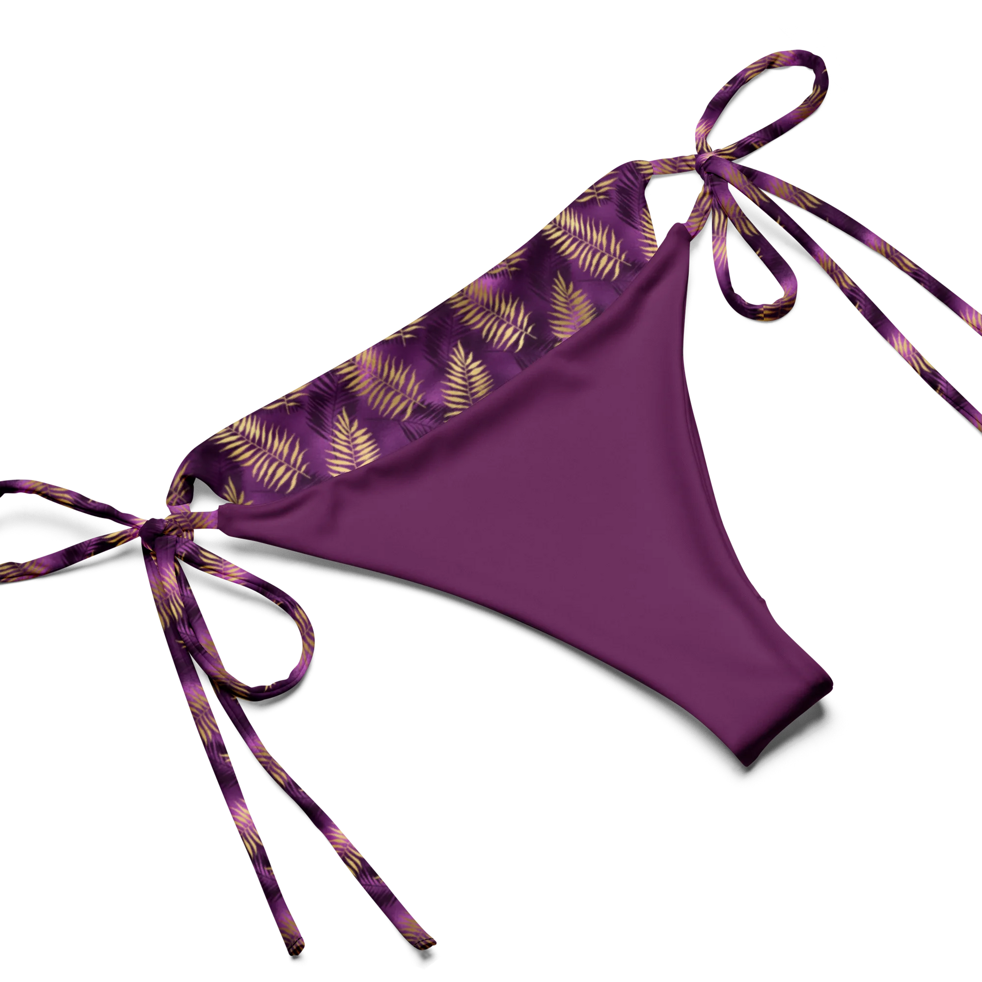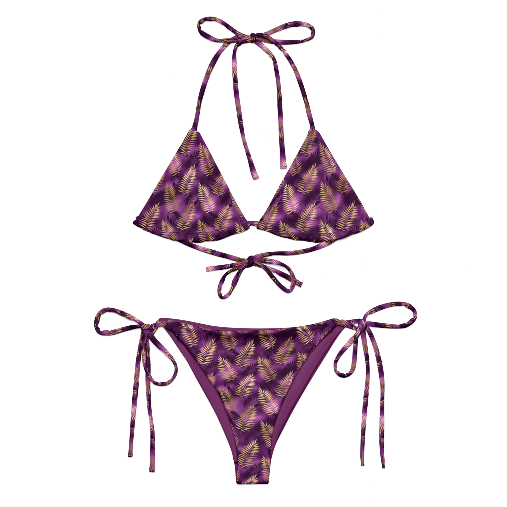 Introducing the Violet & Gold Tropical Magic Recycled String Bikini. Made from recycled materials, this chic and sustainable choice features vibrant colors and tropical elements for a lively and stylish beach ensemble. Immerse yourself in tropical magic with this eco-conscious string bikini.