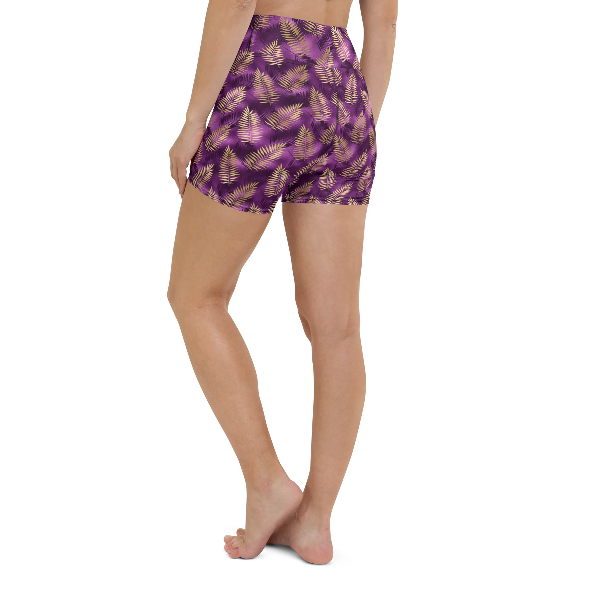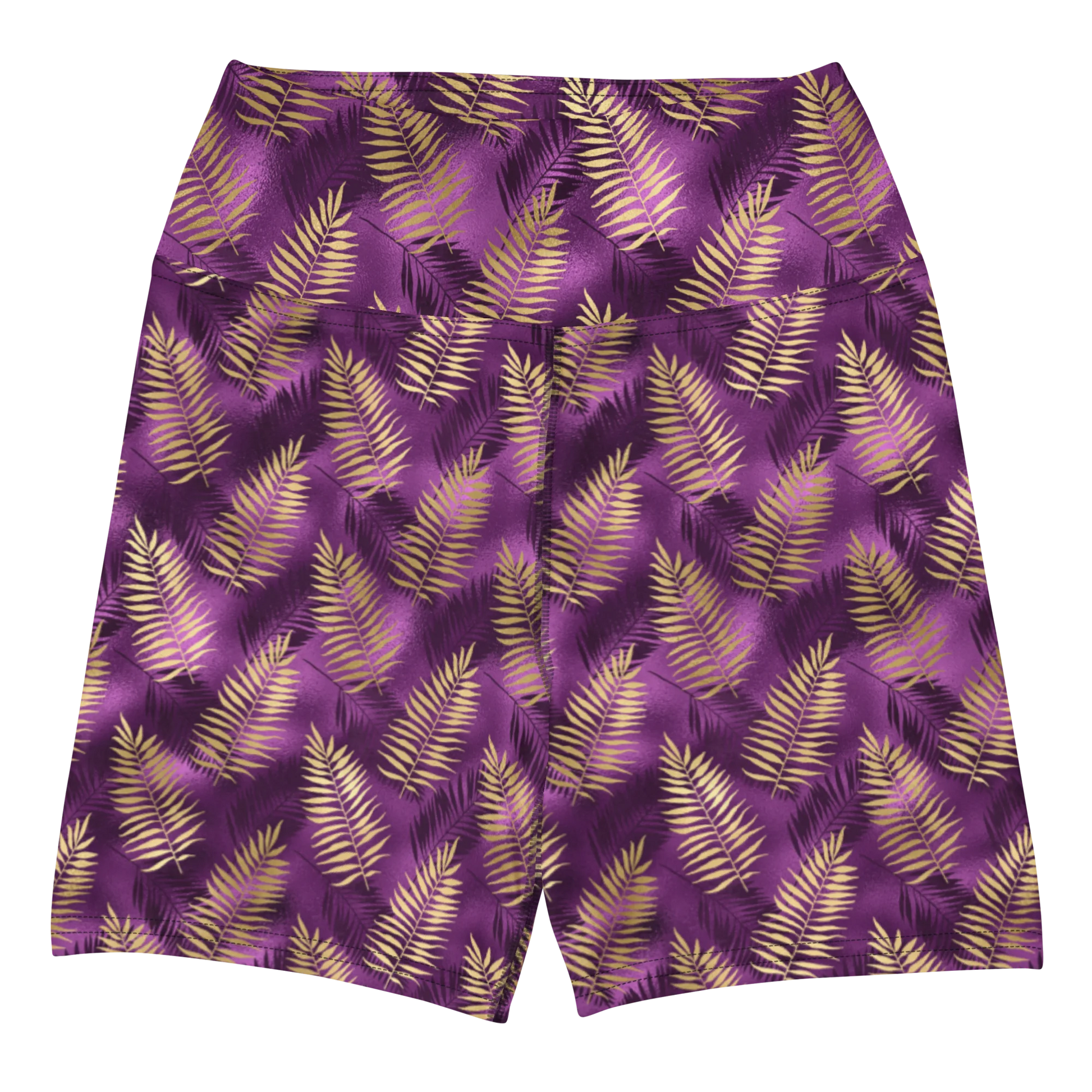 Enhance your yoga practice with the Violet & Gold Tropical Magic Yoga Shorts. The eye-catching design and vibrant colors will transport you to a tropical paradise, while the functional and stylish design makes them perfect for any yoga enthusiast. Feel the magic of the tropics in every pose.
