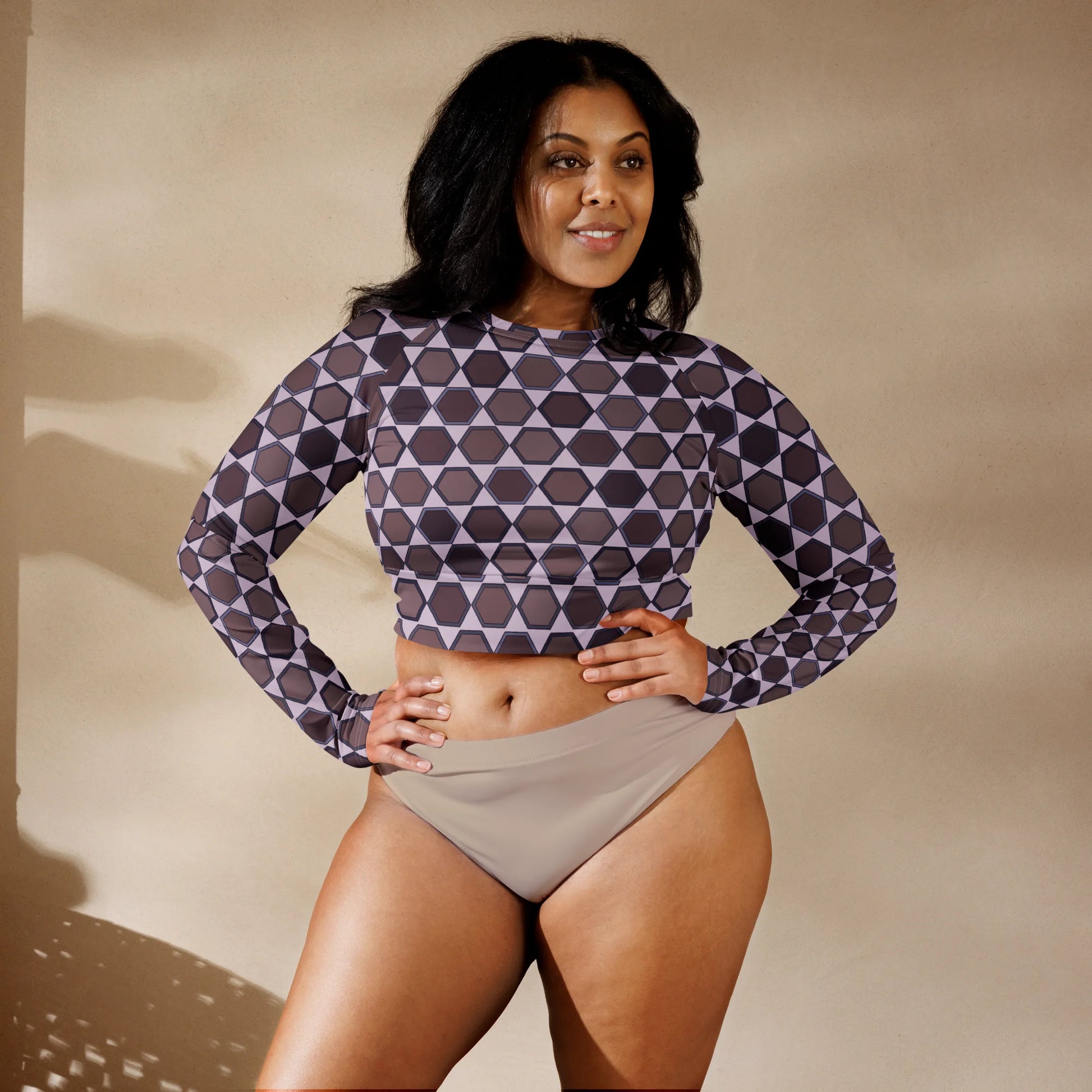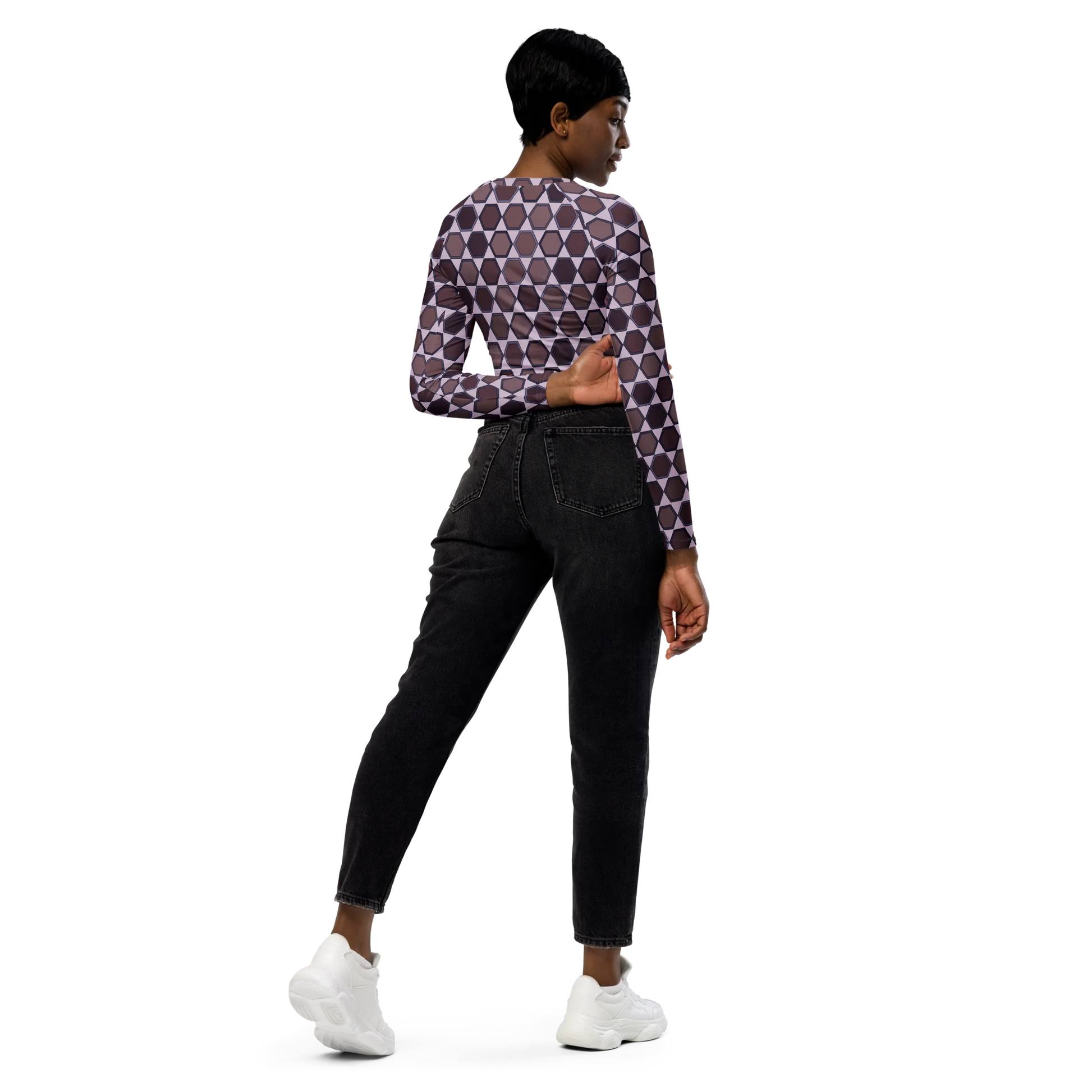 Look and feel great with the Wine Honeycombs Abstraction Recycled Long-sleeve Crop Top. This stylish top features an abstract honeycomb pattern and a deep wine color, making it a unique and sophisticated addition to any wardrobe. Crafted from recycled materials, it is also eco-friendly and contributes to a greener planet.