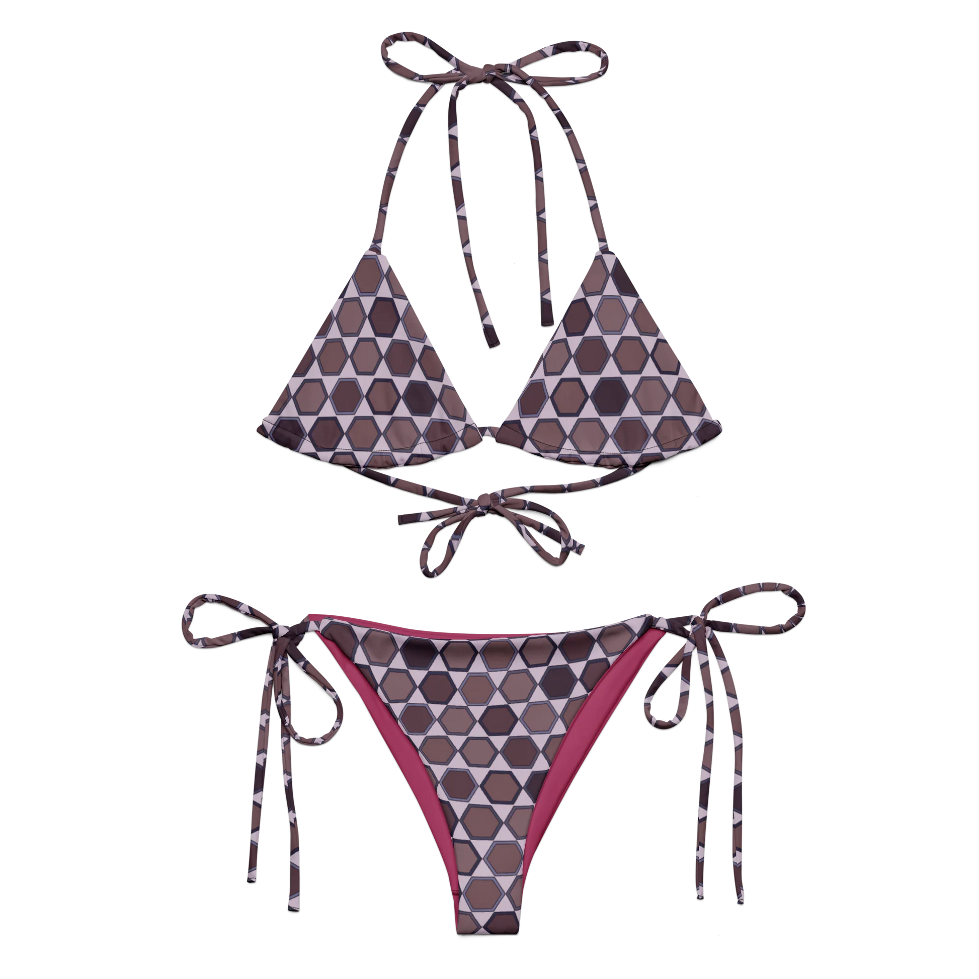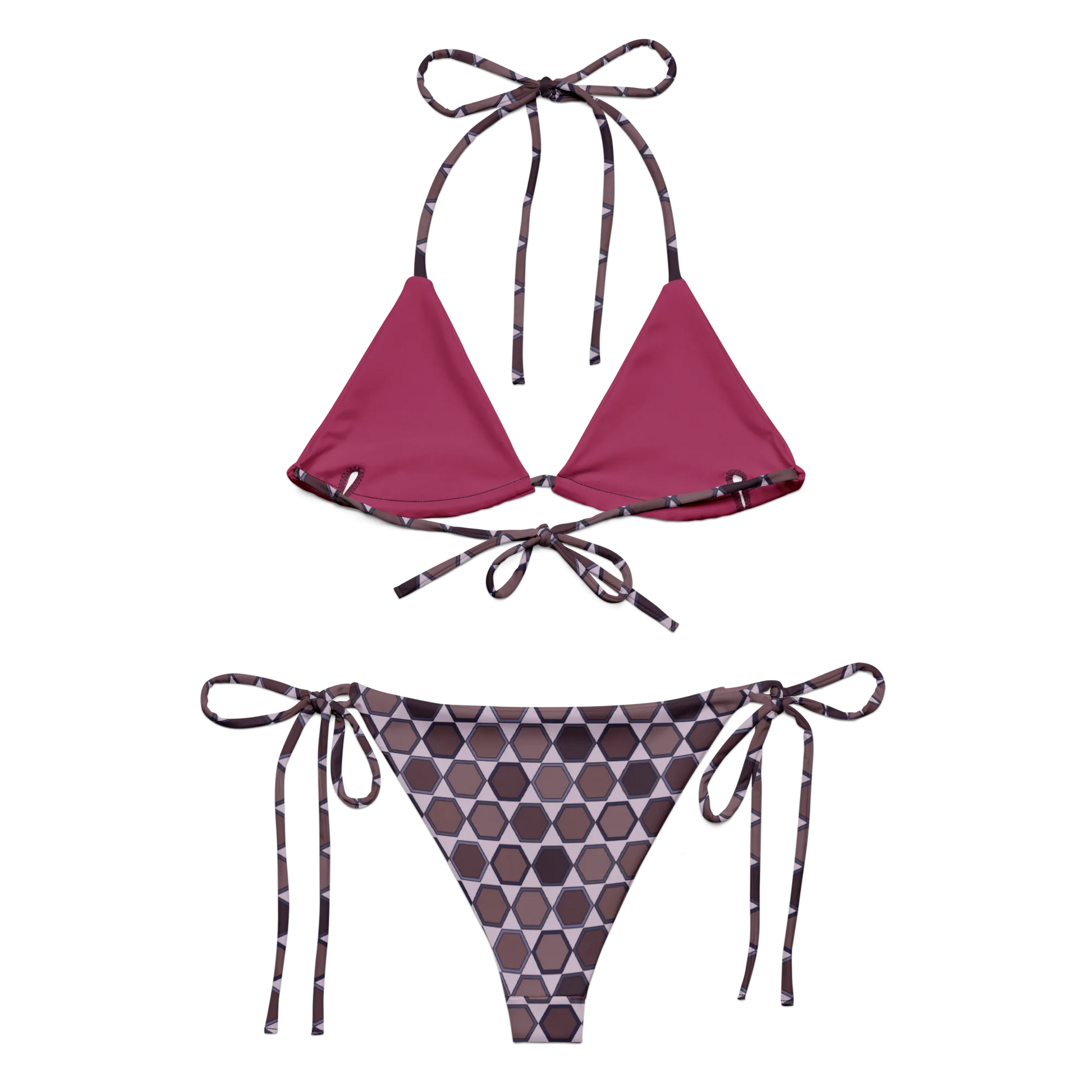 Indulge in the ultimate blend of style and sustainability with the Wine Honeycombs Abstraction Recycled String Bikini. Featuring a stunning wine color and abstract honeycomb pattern, this eco-friendly bikini is both fashionable and conscious. Made from recycled materials, it's the perfect choice for a beach day with a conscience. Elevate your swimwear game with the Wine Honeycombs Abstraction Recycled String Bikini.